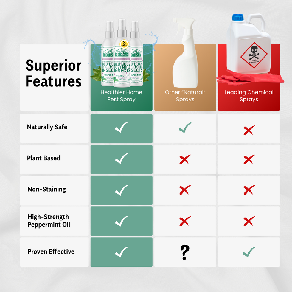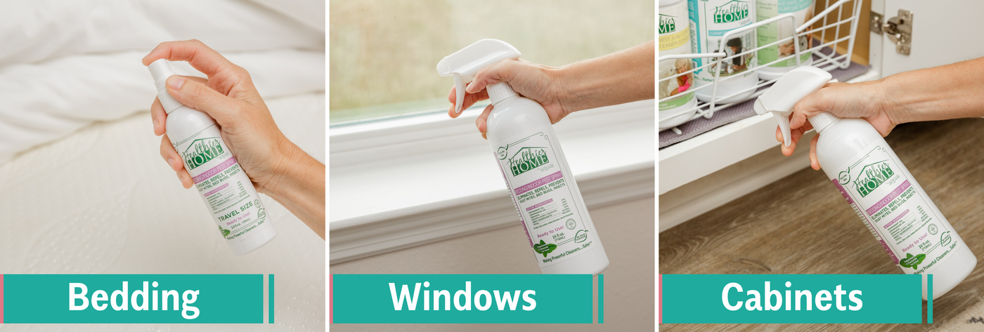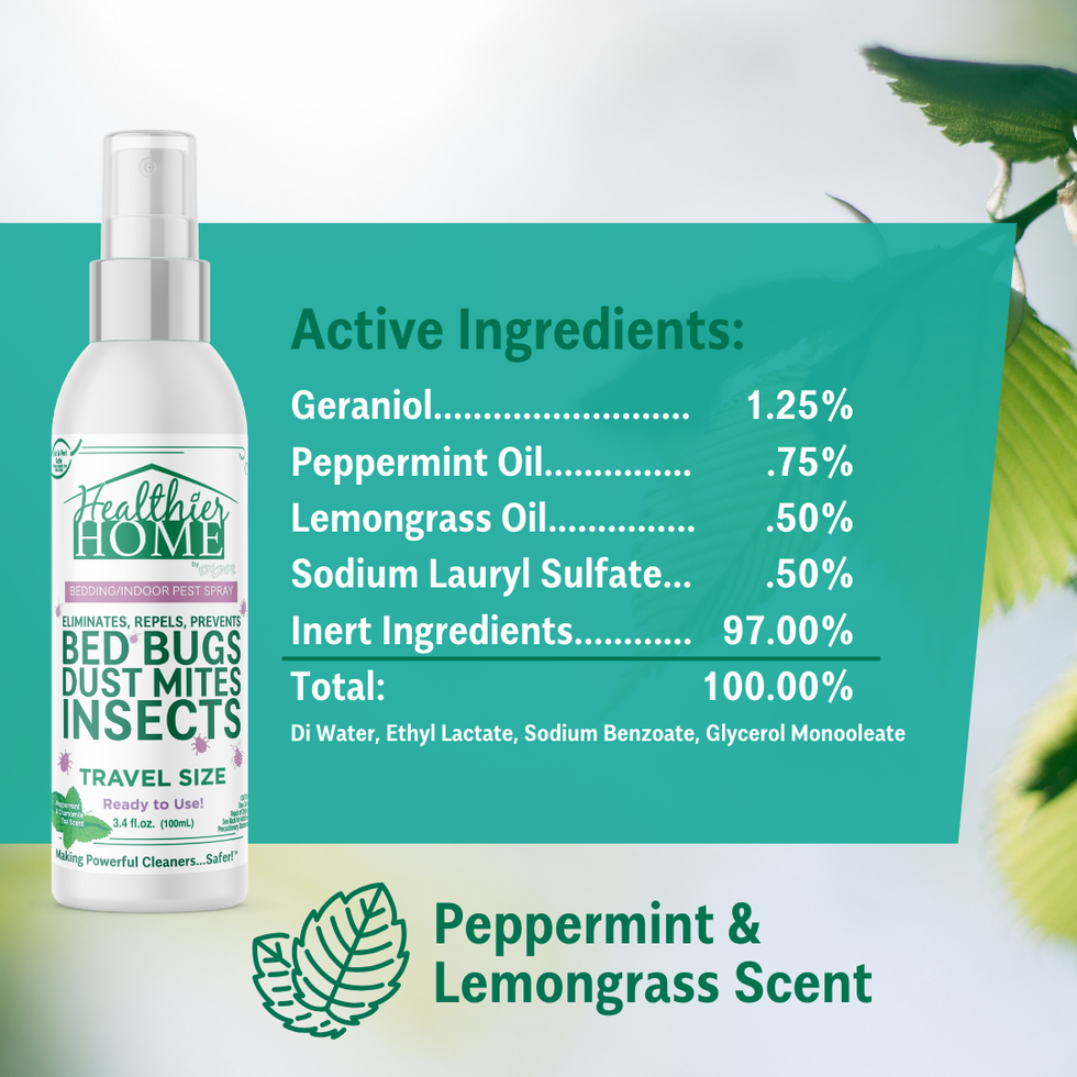Enter Healthier Home Products bedding spray. Airport approved and safe to travel in your bag. It smells great (like peppermint and lemongrass), and we aren't just saying that about ourselves. We tested this product for over a year with some of the world's top influencers and it came back with RAVE reviews. We developed this product using only the safest, cleanest, yet most-effective ingredients on the planet to not only ensure that your family, pets, and children are safe, but that the product actually works like the Dickens.