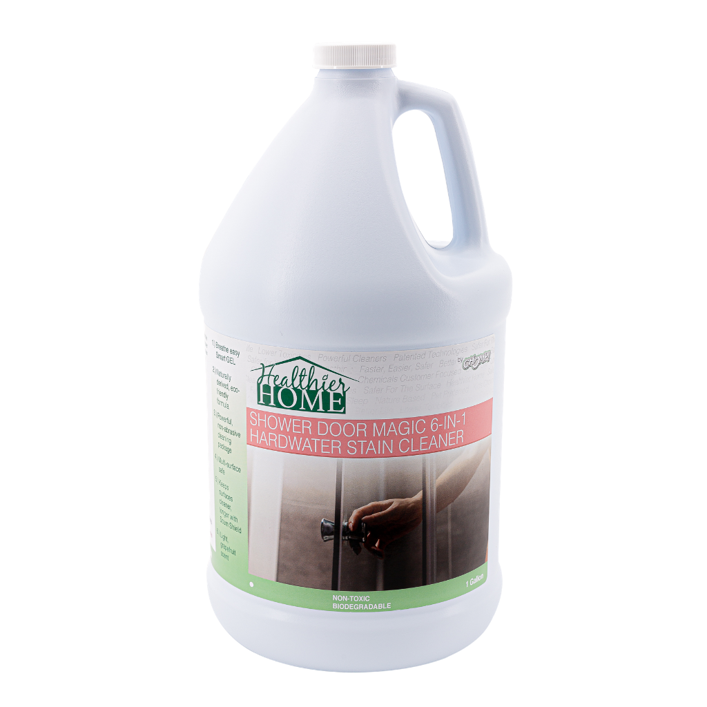 Shower Door Magic 6-In-1 Hardwater Stain Cleaner is a non-abrasive gel formula that safely cleans hard water, calcium, and soap scum from glass, plastic, fiberglass, chrome, aluminum and other shower surfaces. You’ll be left with nothing but a light, grapefruit scent. Surfaces will be cleaner for longer with months of protection from our patented Scum Shield™ polymer.